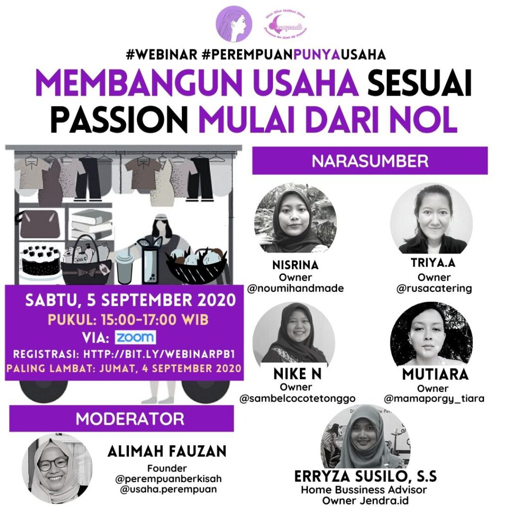Topik yang disampaikan oleh Perempuan Berkisah dan Droupadi Foundation dalam webinar “Membangun Usaha Sesuai Passion Mulai dari Nol” pada Sabtu (5/9) membahas serba-serbi memiliki usaha untuk para pemula. Narasumber yang dihadirkan pun dari beragam jenis usaha.